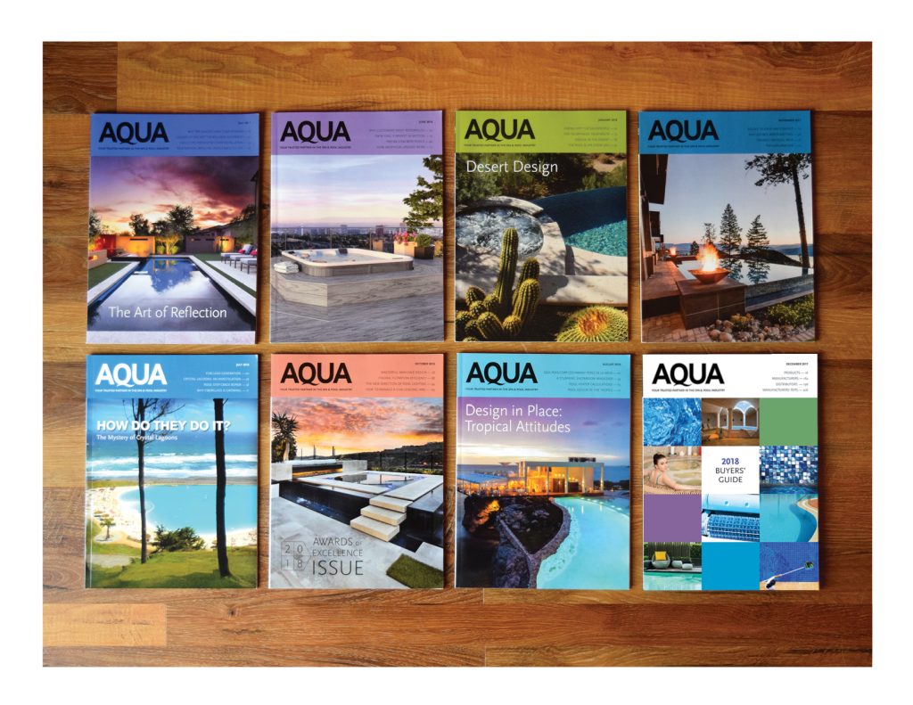 Various covers from Aqua magazine issues of 2018. AQUA is the premiere magazine of the pool & spa industry. All covers were designed and laid out in InDesign using both professional and stock photography. Each issue featured a different color banner to work with the cover image. Photoshop was used to edit photos where necessary.