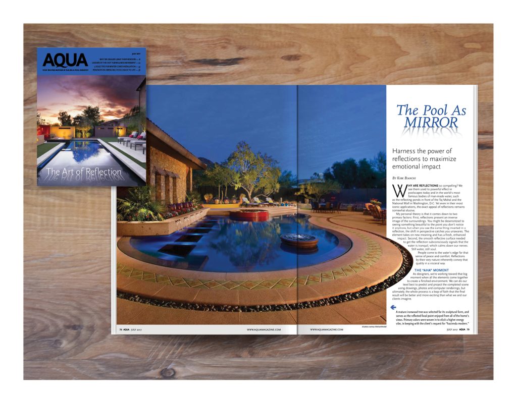 AQUA is the premiere magazine of the pool & spa industry. The cover story for this issue focused on the emotional power of reflection in water. I played up the feel of reflection by mirroring the subtitles in some way. I used Illustrator to create the mirrored text, then stretched and faded it away from the original. The layout was generated in InDesign including the cutout on the right side of the image and the text wrap that was applied.