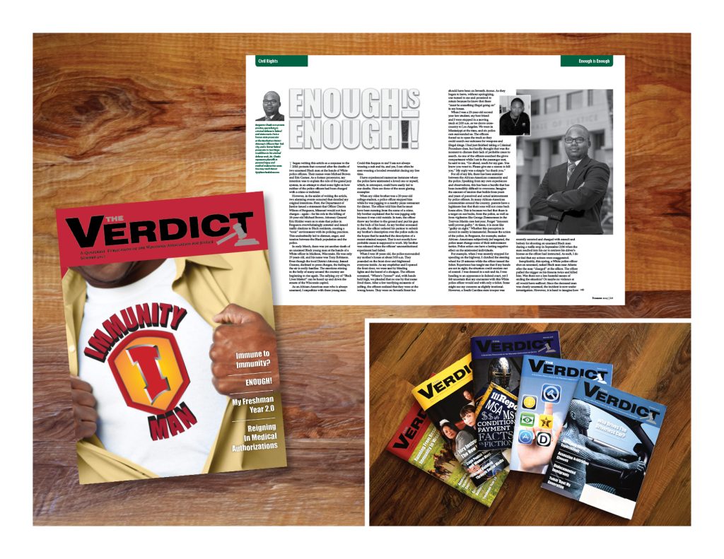 The Verdict is a quarterly publication from the Wisconsin Association for Justice. Early issues of the magazine were small and black and white due to budget constraints. I was able to give the publication a “makeover” without blowing the budget. The result was a full-color front and back cover on quality paper, a larger page size, and two-color inside spreads. Professional photos were rarely available. I made use of a number of free and low-cost stocks sites to find cover and editorial images to use throughout the publications. I also used Photoshop to edit and manipulate photography, Illustrator to make logos and illustrations, and InDesign to layout the entire magazine.