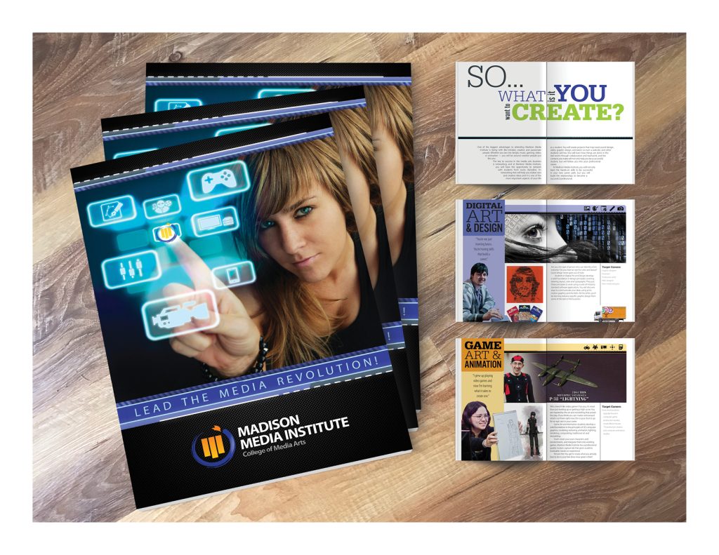 I created this collateral piece as a way to recruit new students to the many media arts programs offered at Madison Media Institute. Illustrator, InDesign and Photoshop were used to complete the project. Some stock and professional photos were used and manipulated.